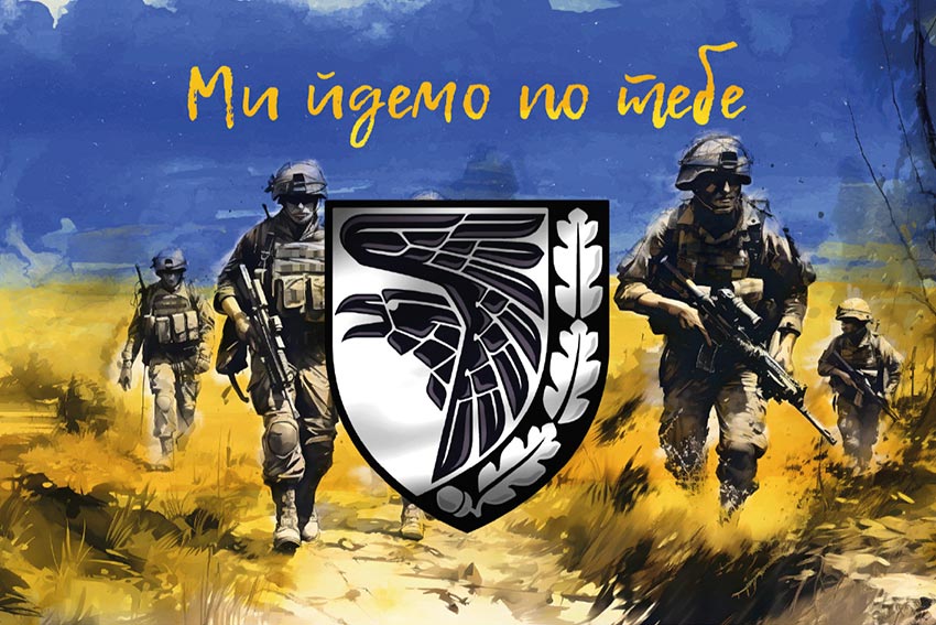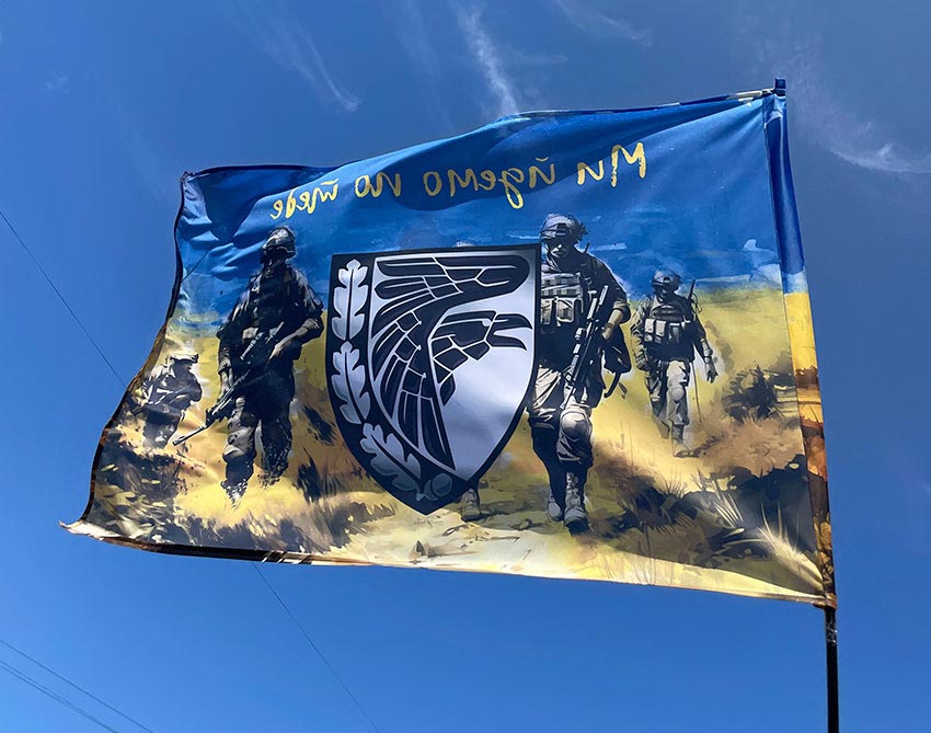 Прапор 93 окремої механізованої бригади (93 ОМБр) «Холодний Яр» ЗСУ «Ми йдемо по тебе»